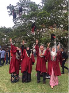 添付の写真は、最後の物理的な卒業式(2019年秋)の時のもので、JBの本校キャンパスで撮ったものです。この3名がその年の卒論指導生でした。私は何時も、教え子達を祝いたくて本校でのConvocationに参加しますが、この時は近くにいた男子生徒のケープとキャップを借りて、この写真を撮ってもらいました。元々、このような距離感で学生たちと付き合いたいと思ってマレーシアに来たので、今のような状態はとても残念です。